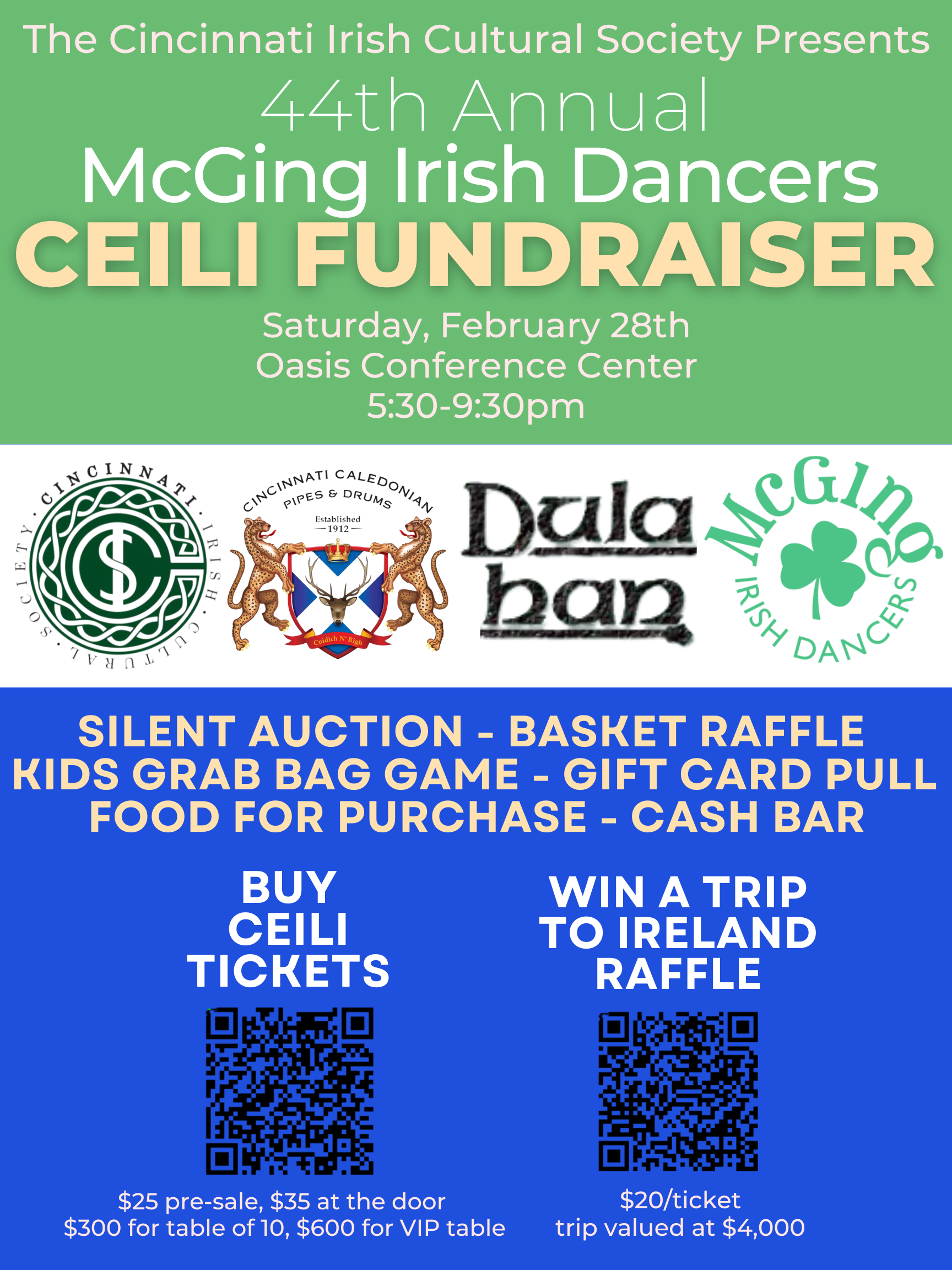 The Ceili is the only fundraiser that supports the operating expenses of the Cincinnati Irish Cultural Society (CICS). The CICS is a 501(c)(3) organization within the State of Ohio and is the non-profit sponsoring organization of the McGing Irish Dancers and the Cincinnati Feis. That means all donations/purchases are 100% tax-deductible!